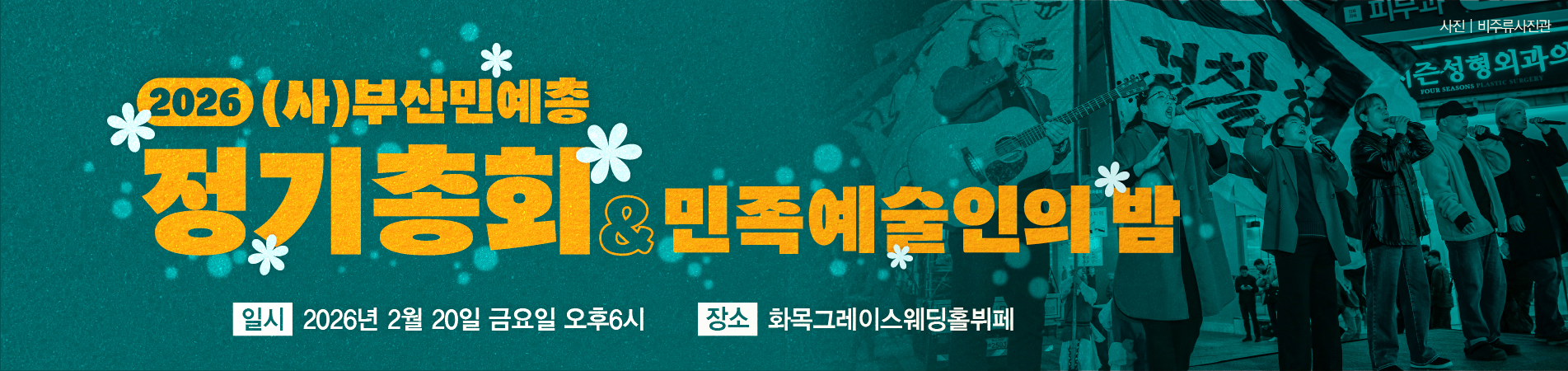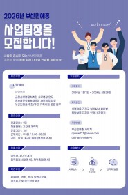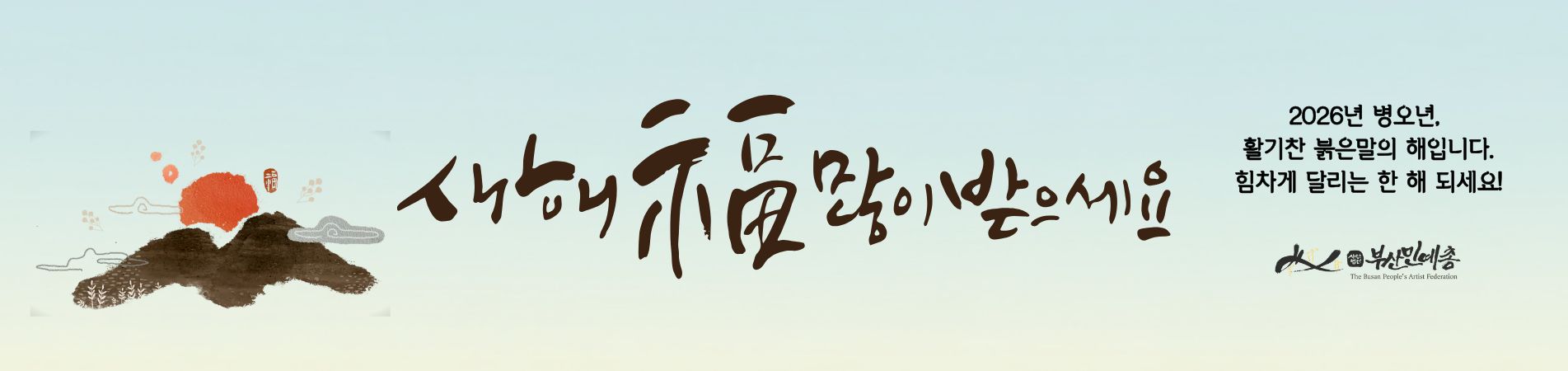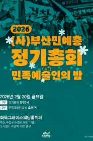 공지사항 2026년도 정기총회 소집 공고 부산민족예술인상 운영위원으로 모시고자 합니다. 2024년 비영리민간단체공익활동 지원사업 평가보고서 [남북협력… (사)부산민예총 사업팀장을 채용합니다. 더보기 웹진 웹진 떠들썩 834호 [2026년 1월 4주차] 웹진 떠들썩 833호 [2026년 1월 3주차] 웹진 떠들썩 832호 [2026년 1월 2주차] 웹진 떠들썩 831호 [2026년 1월 1주차] 더보기 언론보도 영화의전당 야외극장 수놓는 신명의 대동예술제 영호남 예술인들 ‘길의 노래’로 만나다 부산시민단체, 브니엘예고 책임자 처벌·문화예술 교육 정상화 촉… 부산 예술인들 "학생 3명 사망, 브니엘예고 사태 책임자 처벌… 더보기 연대단체 고리2호기 수명연장 반대 [엉망진창 수명연장은 무효다! Q&… 416합창단 2025-2026 찾아가는 기획공연 <별들의 노래… 제국주의 미국 트럼프 규탄 부산집회 부산여성가족과 평생교육진흥원 <부산민주시민교육 시민간담회> 더보기 함께가는예술인 170호 Partner Organizations