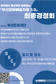 공지사항 즐겁고 풍요로운 한가위 보내세요 '2025 제6회 영호남민족예술대동제 - 길의 노래' 자원봉… [부산민예총 성명] ‘정치적’이라며 전시실을 폐쇄하고, 홍성담… 부산민예총 후원주점에 함께해주실 재능후원자를 모십니다. 더보기 웹진 웹진 떠들썩 822호 웹진 떠들썩 821호 웹진 떠들썩 820호 웹진 떠들썩 819호 더보기 언론보도 영화의전당 야외극장 수놓는 신명의 대동예술제 영호남 예술인들 ‘길의 노래’로 만나다 부산시민단체, 브니엘예고 책임자 처벌·문화예술 교육 정상화 촉… 부산 예술인들 "학생 3명 사망, 브니엘예고 사태 책임자 처벌… 더보기 연대단체 부산YMCA 창립 80주년 기념행사 부산경실련과 (사)시민대안정책연구소 “2025년 터전마련 후원… 홈플러스 사태 해결 촉구 서명운동·시민사회 신문광고 평양시민 김련희 부산 만남의날 더보기 함께가는예술인 169호 photo gallery 게시물이 없습니다.